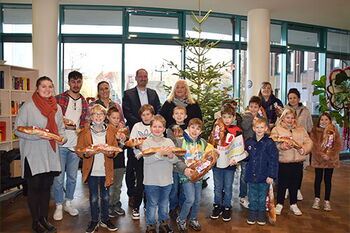 Pünktlich zum ersten Adventswochenende verbreitet auch dieses Jahr ein geschmückter Tannenbaum vorweihnachtliche Stimmung im Eingangsbereich des Kreishauses an der Valkenburger Straße. Den Baumschmuck haben Schülerinnen und Schüler der Janusz-Korczak-Schule Heinsberg gefertigt. Mit Freude und Euphorie schmückten sie die Tanne mit ihren gebastelten Werken aus Pappe und Papier. Philipp Schneider, Allgemeiner Vertreter des Landrates, lobte zusammen mit Petra Büschgens, Gleichstellungsbeauftragte des Kreises Heinsberg, das Ergebnis. Er dankte den Schülern für ihr Engagement und belohnte die Mädchen und Jungen mit Weckmännern und Schokonikoläusen.